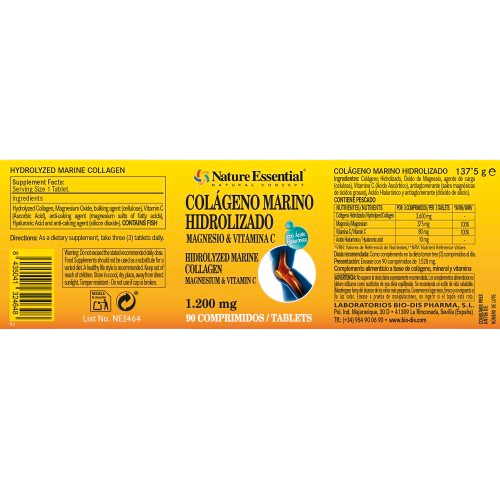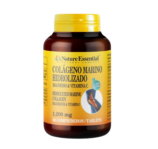 Colágeno Marino 1200 mg е хранителна добавка с висококачествен хидролизиран морски колаген, комбиниран с магнезий, витамин C и хиалуронова киселина. Тази комбинация подпомага здравето на ставите, хрущялите и костите, като насърчава възстановяването на съединителната тъкан, подобрява гъвкавостта и поддържа мускулната функция. Хидролизираният колаген осигурява по-добра усвояемост и ефективност, а съставките са без глутен и лактоза.